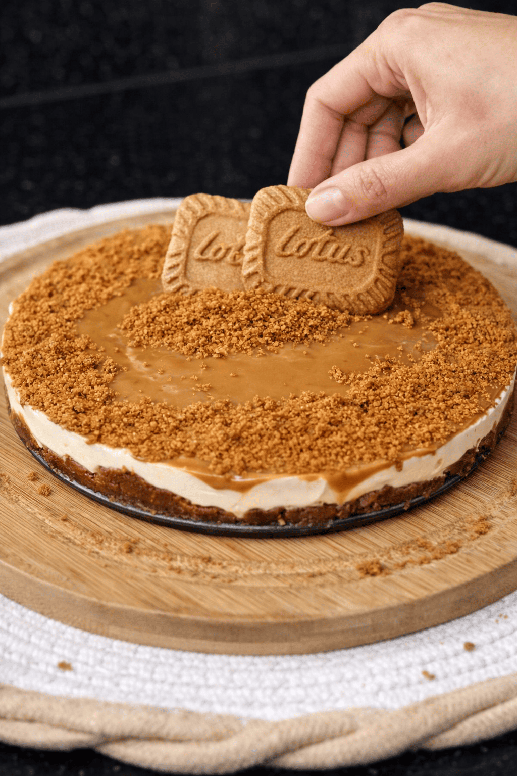 This no-bake Biscoff cheesecake features a crunchy Lotus Biscoff cookie base, a velvety cream filling, and a rich dulce de leche topping — effortless to make and irresistibly indulgent.