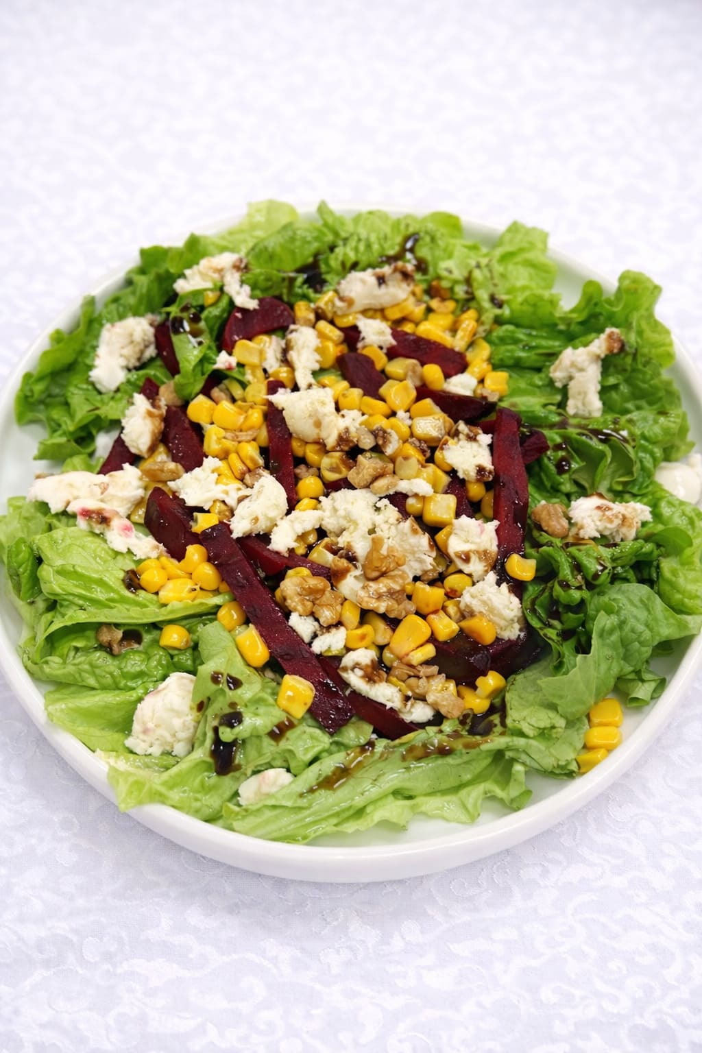 This is such a pretty spring lunch idea when you want something light, colorful, and full of fresh flavor. The beets, corn, and mozzarella make it feel bright and satisfying, while the honey mustard vinaigrette gives it just enough richness without making it heavy.