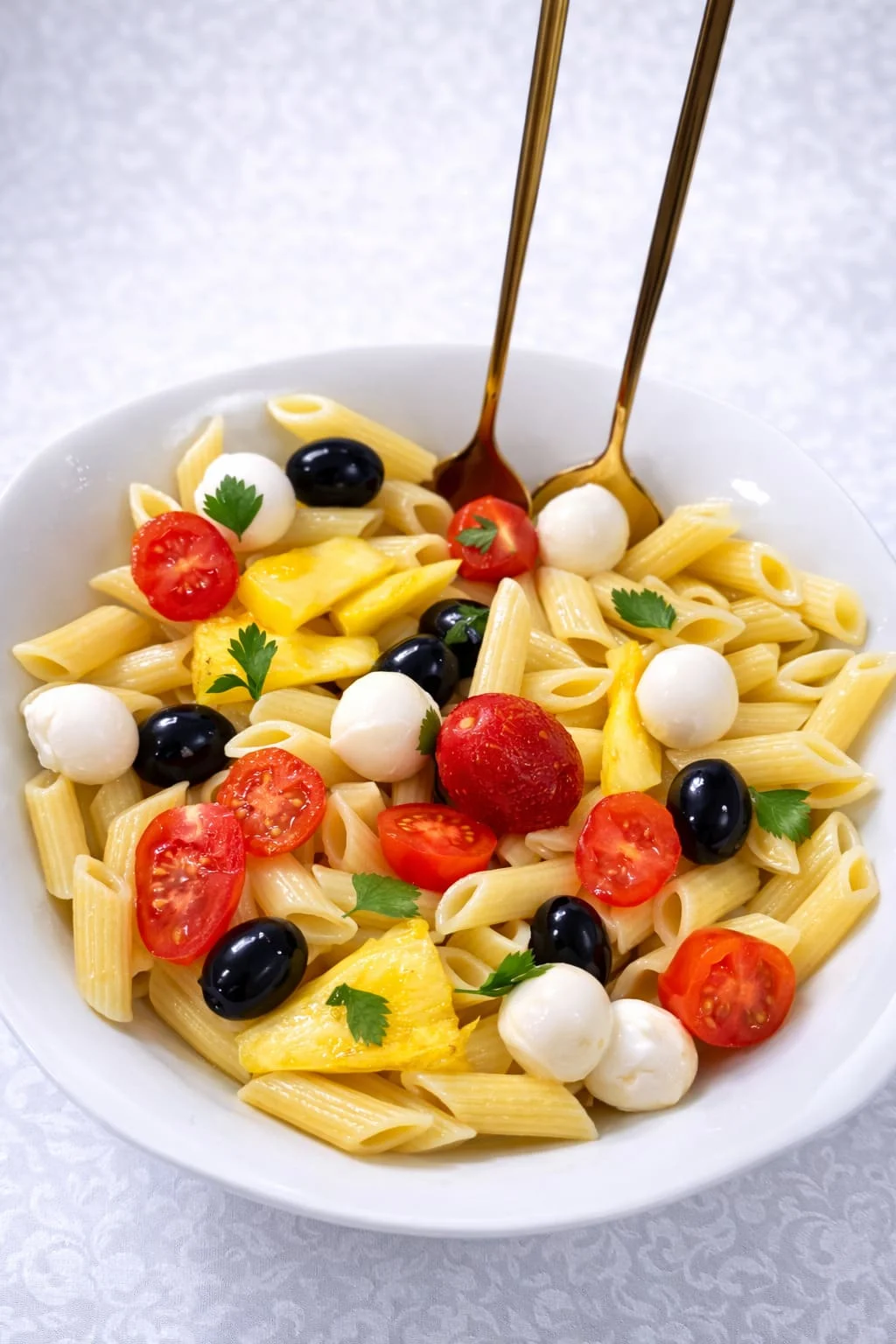 This is such a fun spring lunch idea when you want something fresh, colorful, and a little different from the usual pasta salad. The mozzarella keeps it creamy, while the pineapple and tomatoes make it feel bright, light, and perfect for a quick lunch.