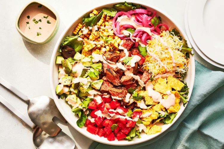 This hearty salad turns taco night into a springtime feast. Grilled steak (seasoned with taco spices) is sliced and served over crisp lettuce along with farmers’ market veggies and all your favorite taco fixings.