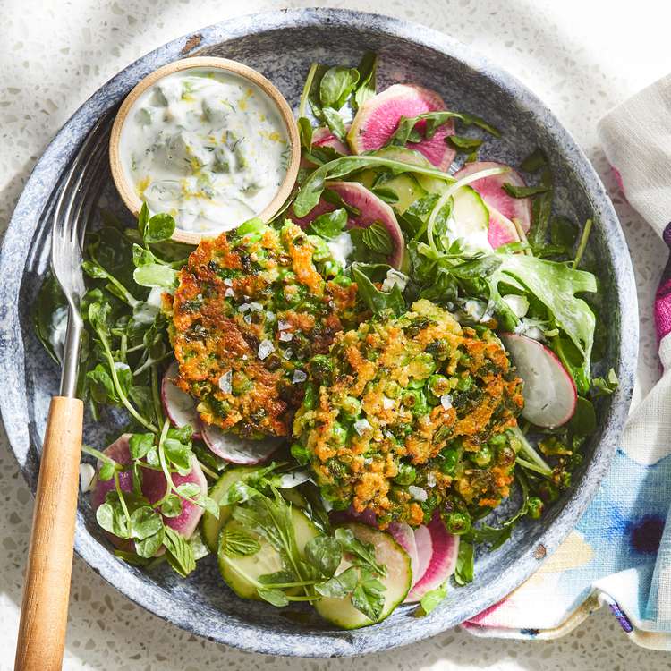 Take your salad game up a notch with these crispy pea fritters on top of mixed greens. Made by mashing peas with fresh mint, lemon zest, and breadcrumbs, the pan-fried cakes add satisfying crunch and bright herb flavor. Finished with a simple dressing, this high-protein vegetarian salad is a fun and fresh way to showcase spring peas.