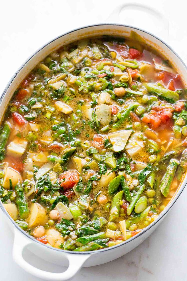 This springtime take on classic minestrone is loaded with seasonal veggies like peas, new potatoes, artichoke hearts, and asparagus. Each vegetable is added in stages to ensure perfect tenderness. Finished with fresh greens and a touch of pesto, this cozy soup is both light and comforting for cool spring evenings.