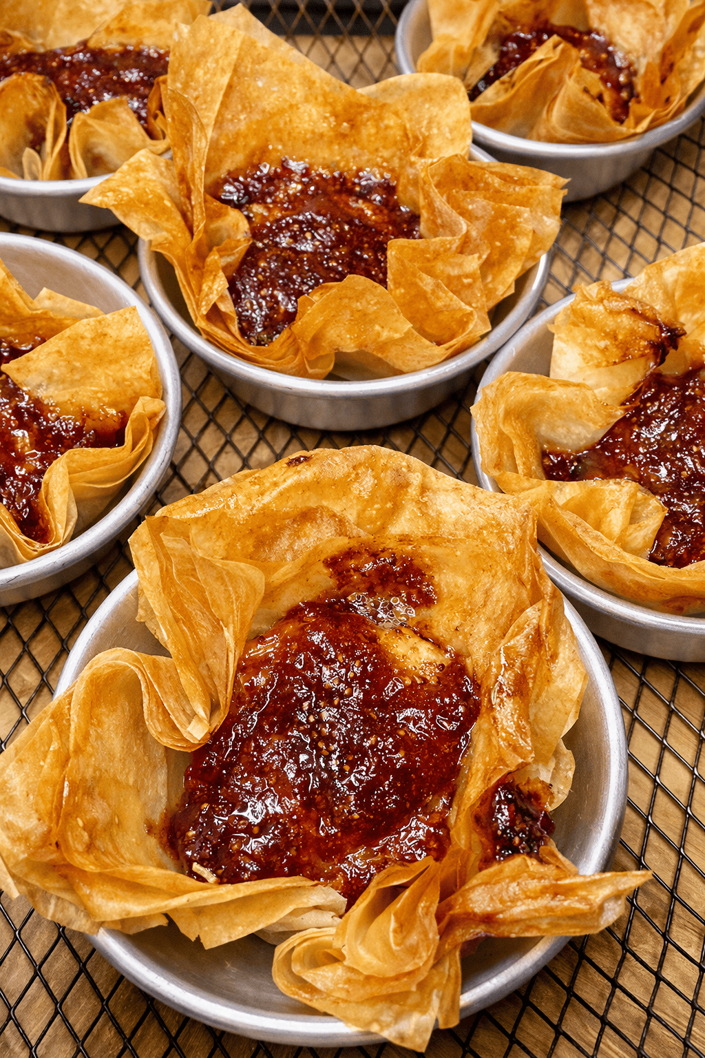 Crispy phyllo cups filled with creamy brie and sweet blueberry preserves — a quick, elegant bite that balances sweet and savoury perfectly.