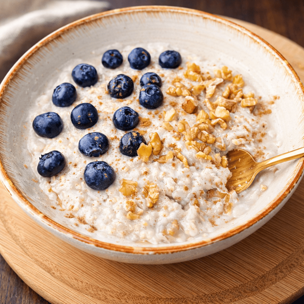 Creamy banana oatmeal cooked with blueberries and walnuts — naturally sweet, hearty and nourishing for a warm winter breakfast that keeps you full without added sugar.