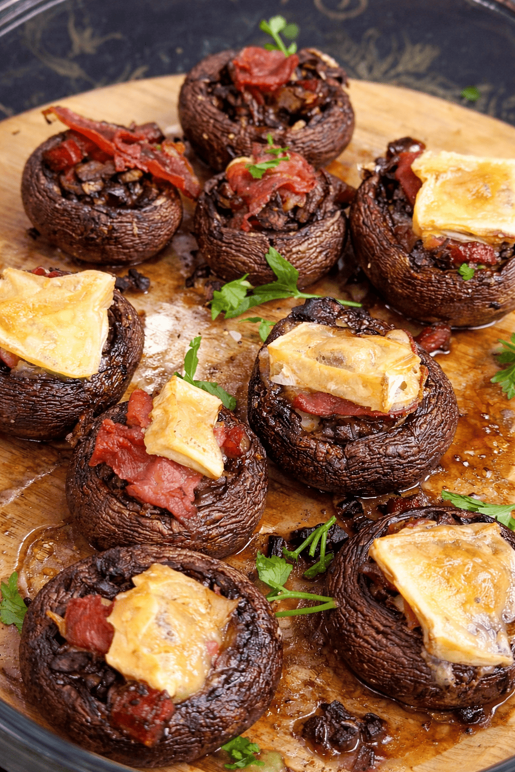 Savoury stuffed mushrooms filled with creamy brie, hearty pork sausage and earthy mushroom stems — warm and satisfying for a filling winter breakfast twist.