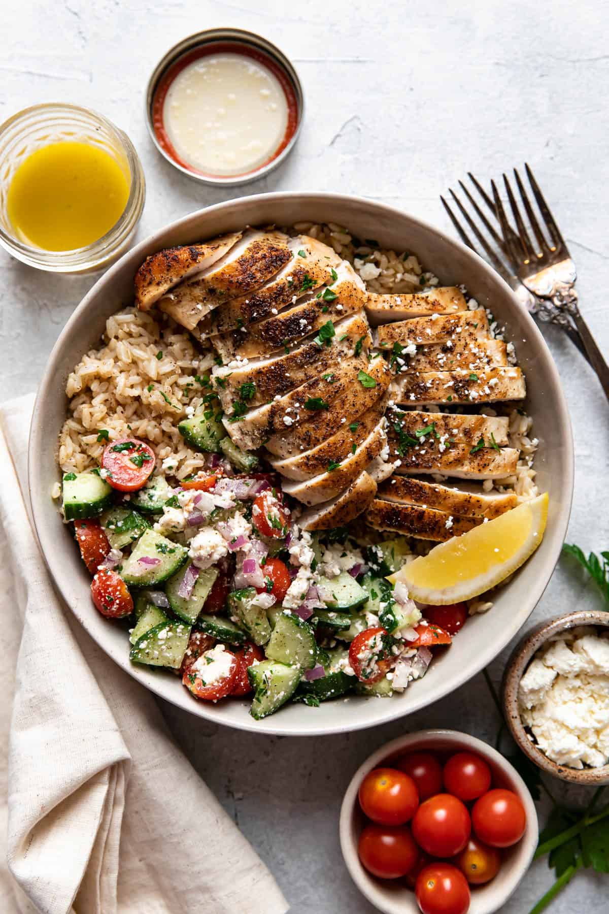 These Greek chicken bowls are a great pick when you want something healthy that still feels hearty. The seasoned chicken, brown rice, and cucumber salad bring in plenty of texture and freshness, which makes the whole bowl especially nice for spring meals.