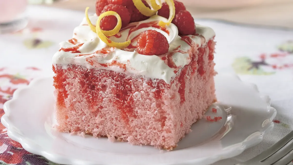 This cake combines raspberry gelatin with lemonade for a bright, tangy flavor that feels perfect for spring and summer. The pink tone is cheerful and inviting, and the finished cake has a soft, party-ready look that photographs beautifully.