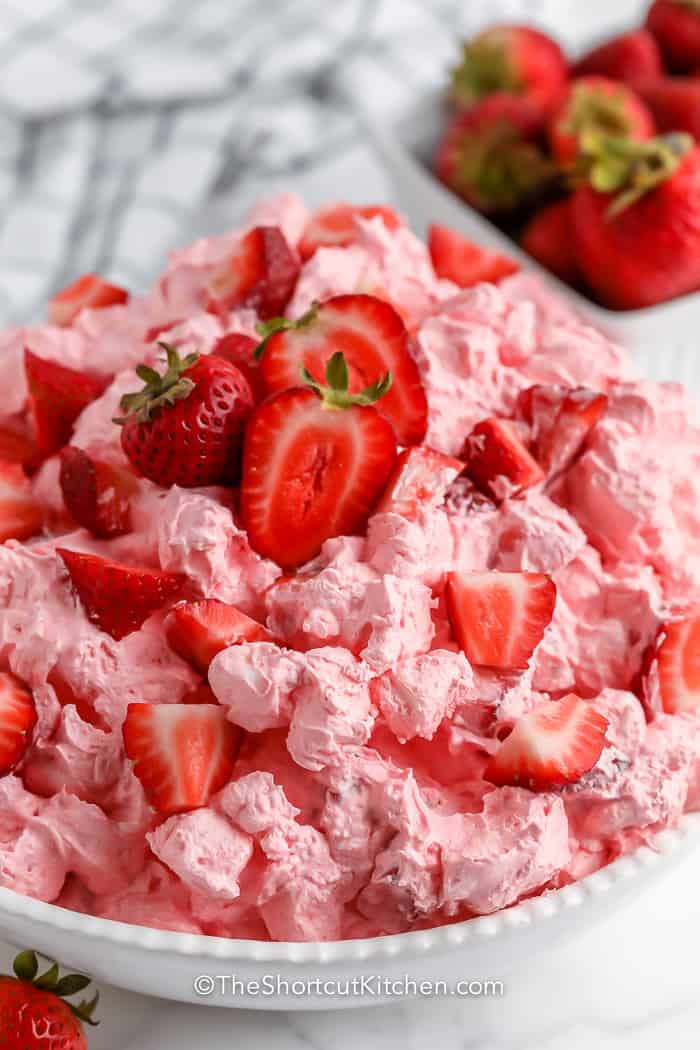 This fluffy pink dessert blends strawberry Jell-O with whipped topping and strawberries for a creamy, cloud-like texture. It is one of those easy gelatin desserts that looks cheerful on the table and works especially well for casual entertaining or family celebrations.