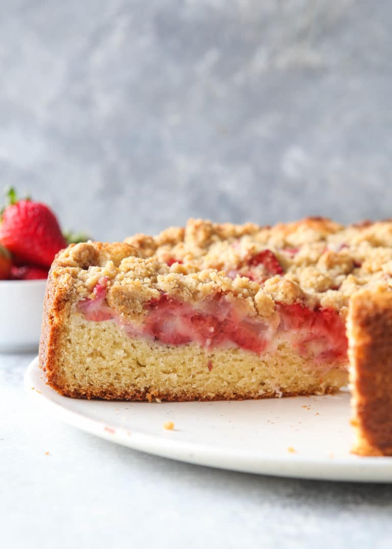 This cake has a vanilla base, a jammy strawberry-rhubarb layer, and a buttery crumble topping—everything you want for spring brunch and afternoon gatherings. It’s easy to serve in squares, and the sweet-tart flavor feels seasonal and bright.