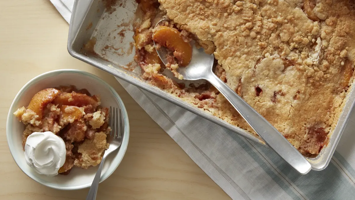 This recipe leans into that Southern-style cobbler vibe with ripe peaches and a sweet, airy topping baked until golden. It sounds like one of those dependable desserts that’s easy to serve warm with vanilla ice cream for a simple summer finish.