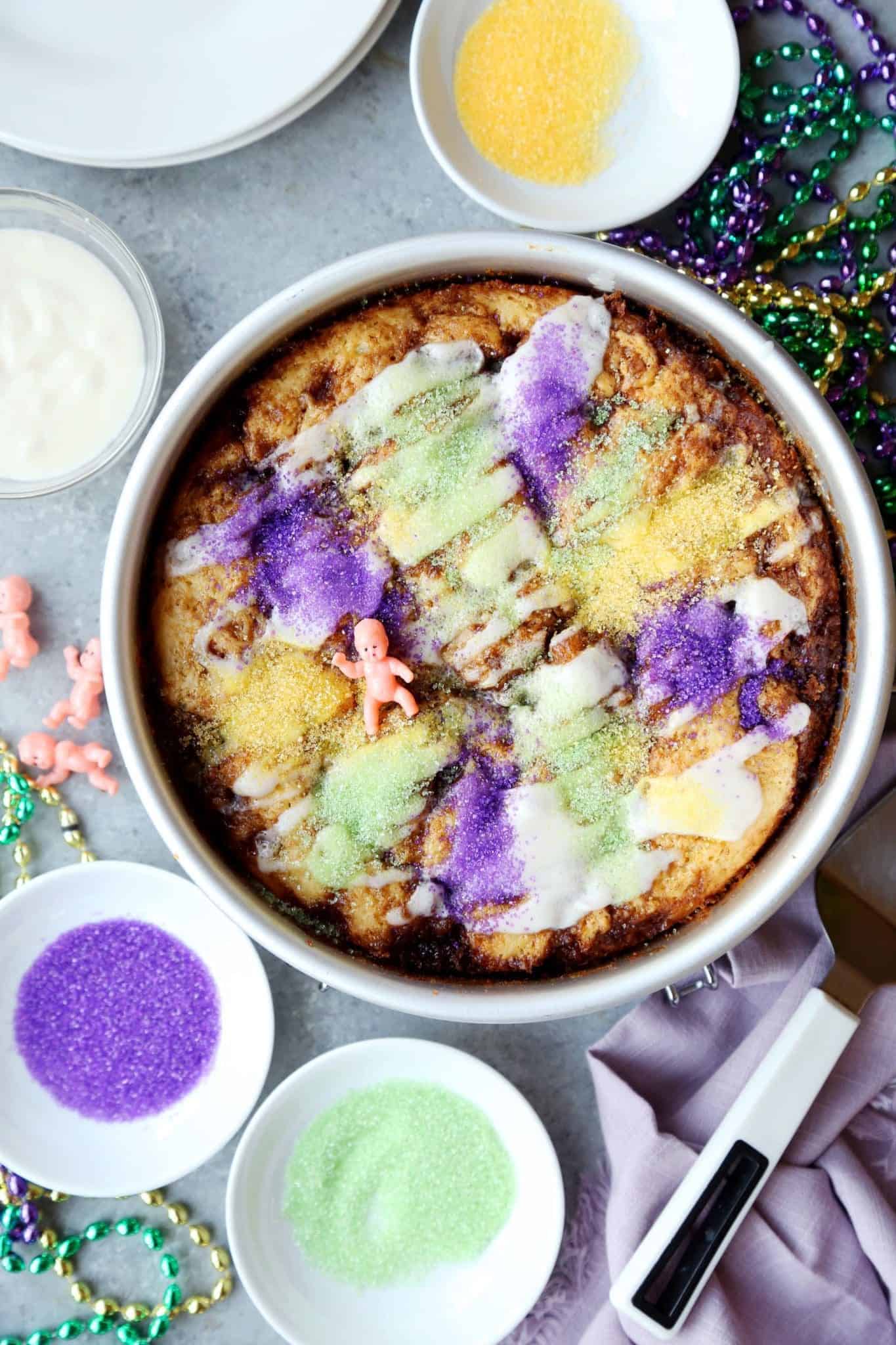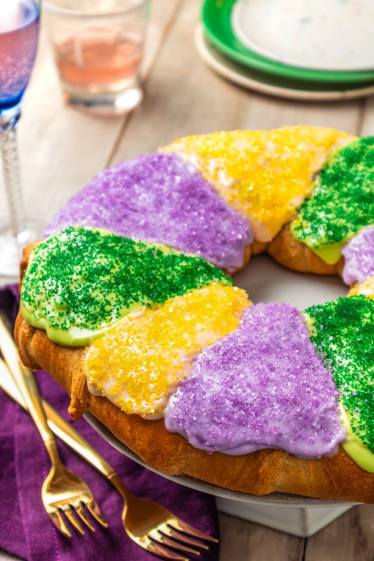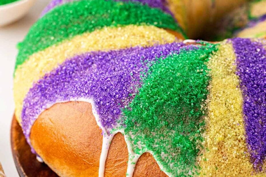A super-quick version made with refrigerated crescent dough and a creamy filling. It bakes fast, still looks festive once glazed and topped with colored sugars, and is a great “last-minute Mardi Gras” dessert when you don’t want to work with yeast.