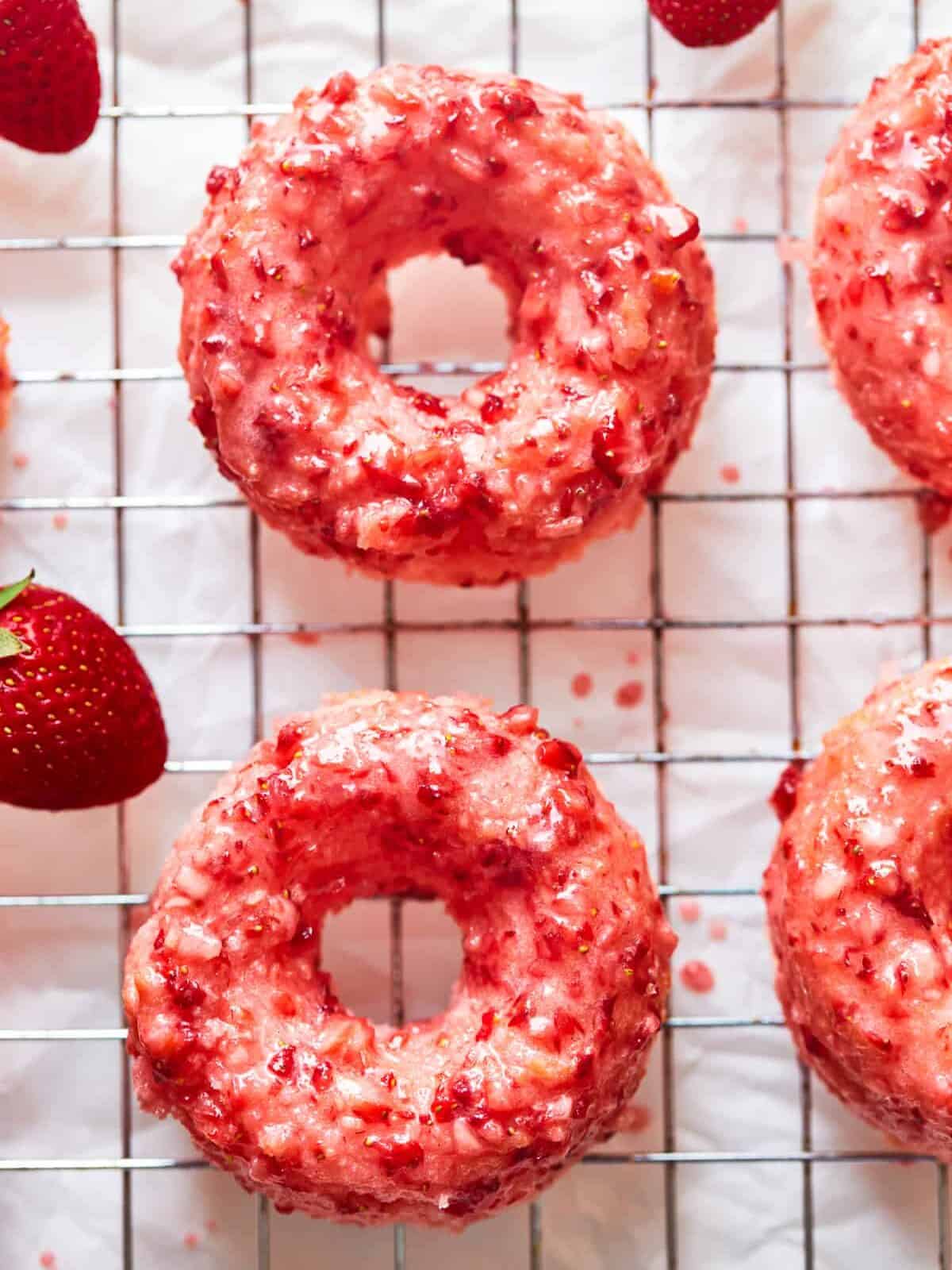 These donuts go richer and more “dessert-forward,” using cake mix plus heavy cream for a tender bite. The strawberry-forward glaze and fresh berries make them feel like a bakery case treat—without yeast, proofing, or complicated steps.