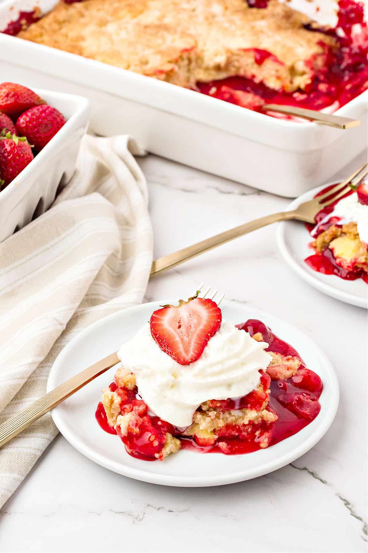 This version adds a creamy cheesecake element to the dump-cake idea, giving you gooey, buttery, and tangy all in one pan. Strawberry cake mix makes it even more on-theme, and it’s a great option when you want “comfort dessert” energy.
