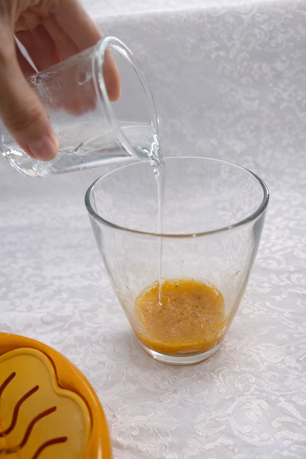 1) In a tall, wide glass, add the turmeric powder, ground ginger, and black pepper. Stir the dry ingredients together first so everything is evenly combined.