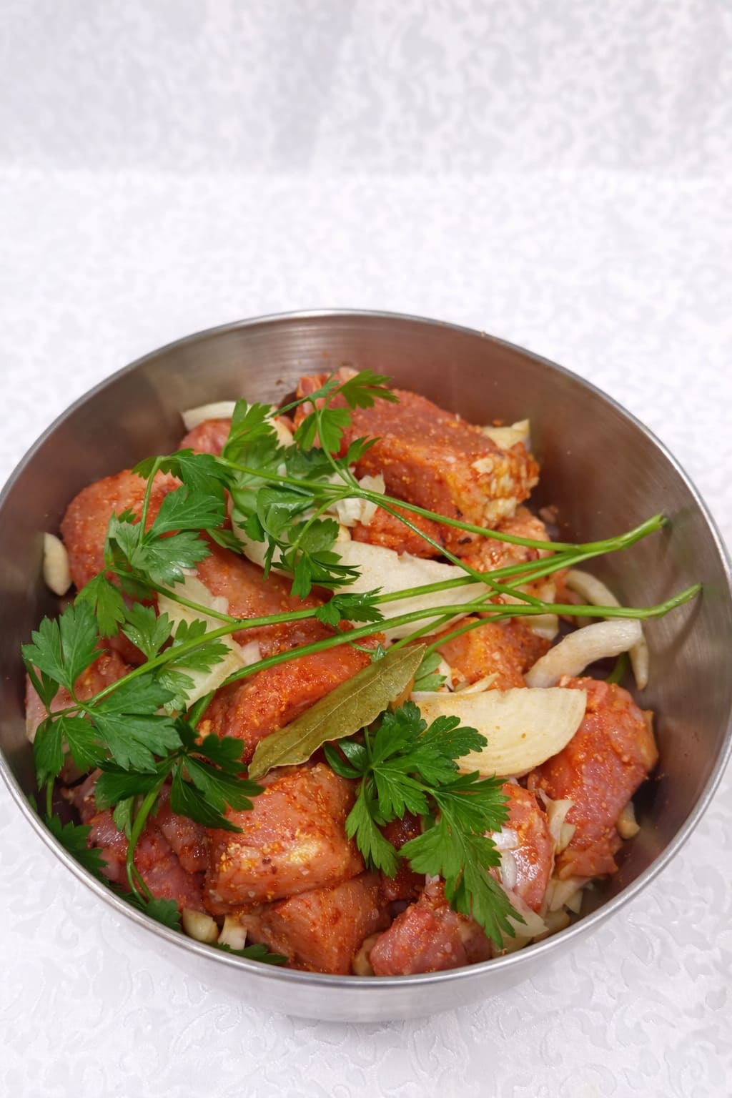 2) Add salt, cayenne pepper, garlic powder, paprika, white wine, olive oil, sliced onion, minced garlic, parsley, and bay leaf. Mix everything well until the pork is fully coated.